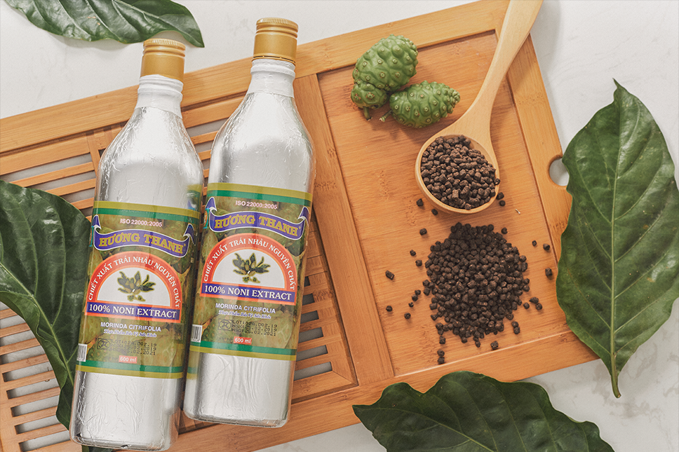 When noni is unripe , its colour is light green, its length is from 5 – 7cm, its width is from 3 – 4 cm, the fruit’s eyes are floated on the surface of the fruit. The more it is ripe, the more its colour is yellow and The fruit’s eyes do not emerge as before ; but it still has scratches , silky smoothness and its smell is stink. Noni is the fleshy fruit including many nuts glued together. When the fruit is ripe, the flesh can be eaten and has lots of oval nuts, its shape is one part of sharpness and one part of square.
